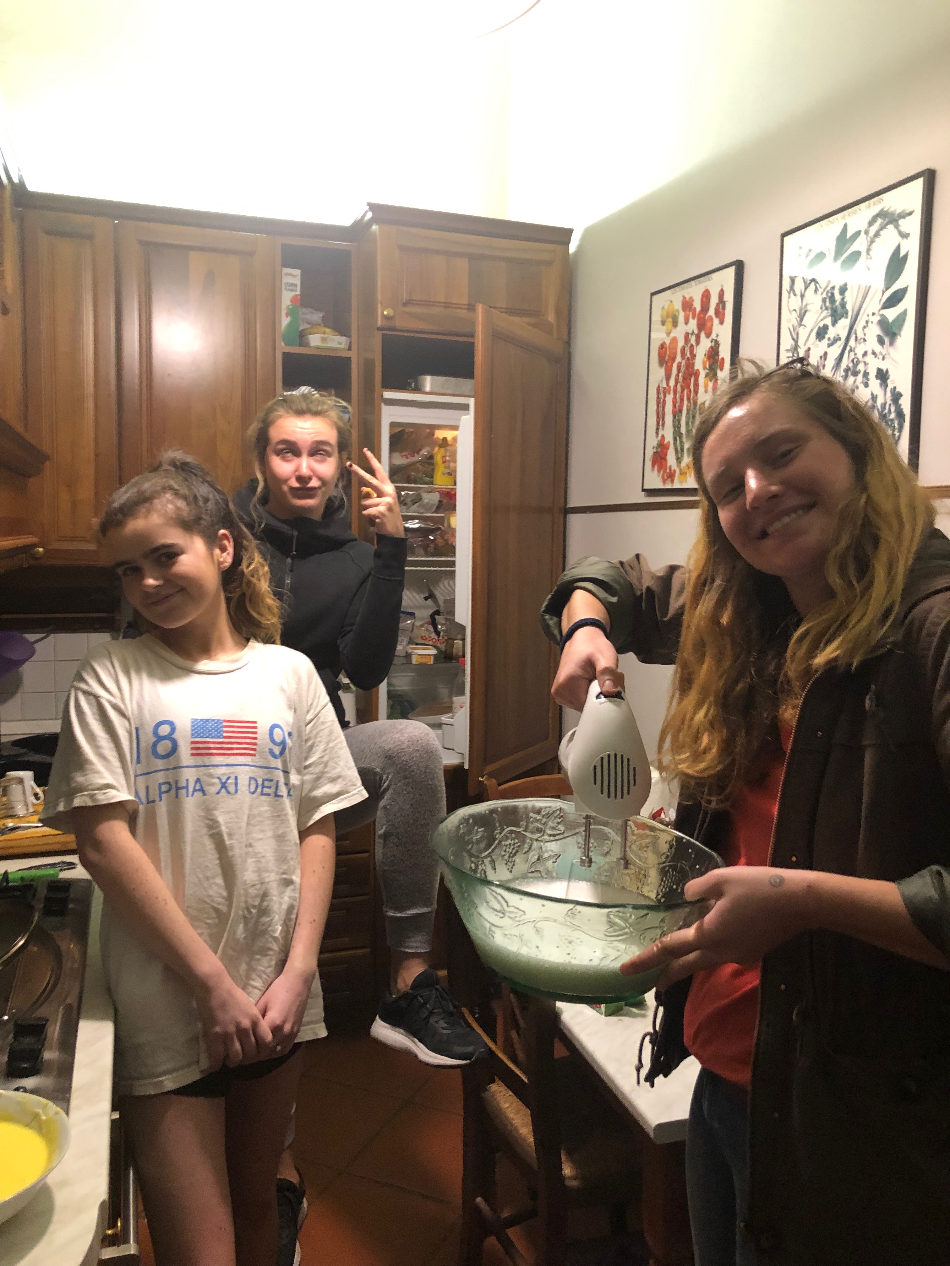 Conad was busy in the evening, which didn’t help our frazzled search for these mysterious ingredients. With help from a few Conad employees, we managed to find everything we needed. Next step was to find the necessary supplies in the kitchen which is stocked with various utensils but lacking many important things. We discovered we had a mixer (!) which was great because I’m not sure how we would’ve made the whipped cream without it. After preparing ourselves, we hung around the living room waiting for someone to get the motivation to tell us all to start. Luckily, Brooke took the lead and started delegating tasks. This was perfect because with a few people working at a time everyone could work on part of the recipe and the kitchen never got too crowded.